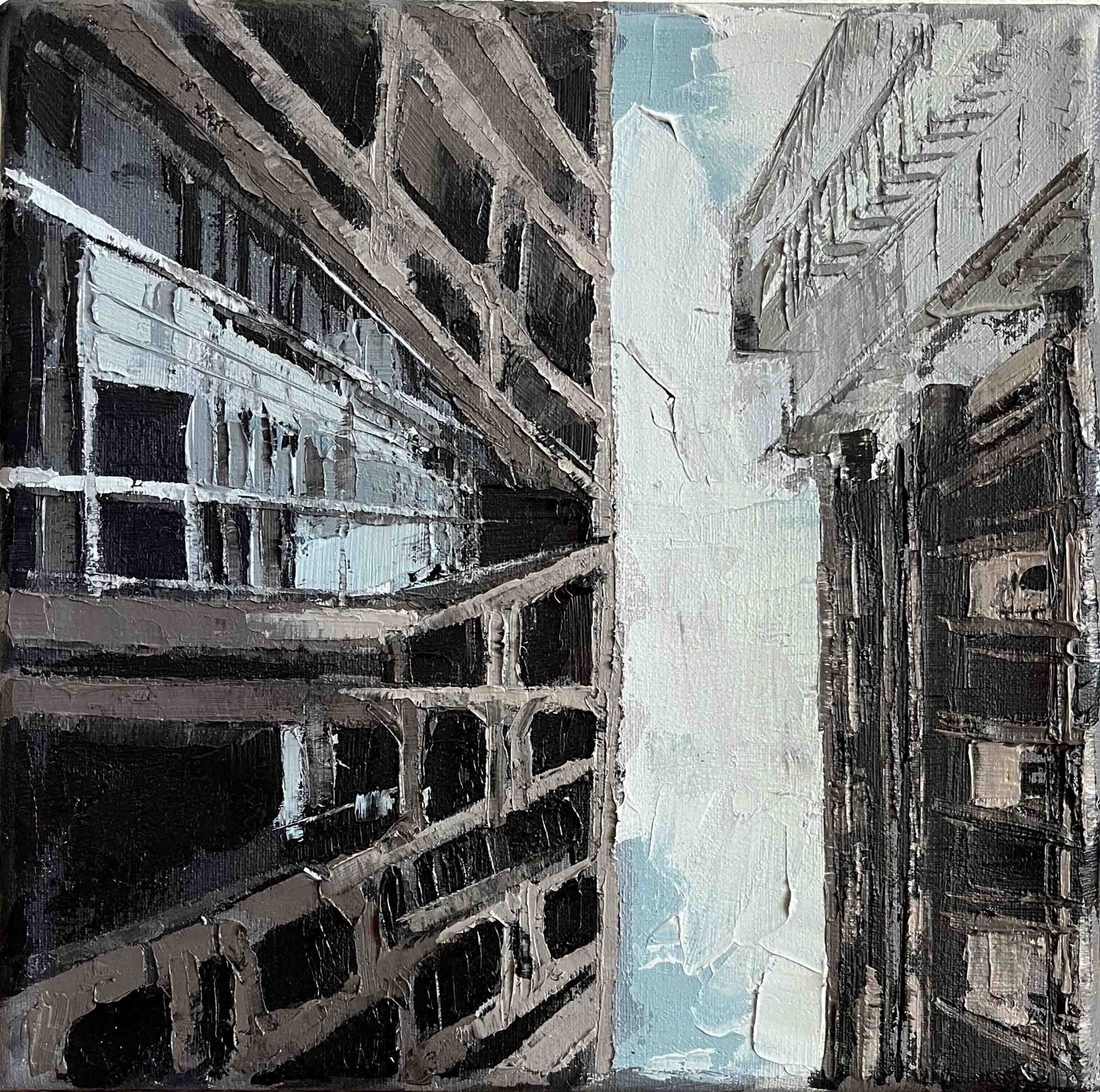 Pintura al óleo aplicado con espátula sobre bastidor entelado.