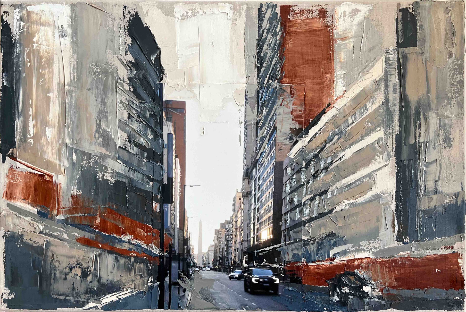 Fotografía intervenida con pintura al óleo aplicado con espátula sobre bastidor entelado.
