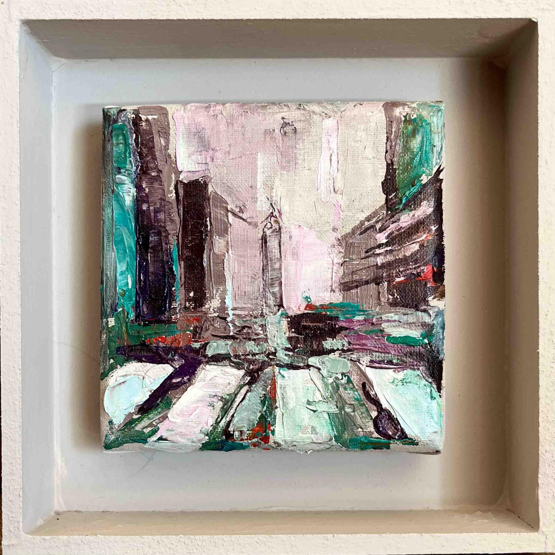 Pintura al óleo aplicado con espátula sobre bastidor entelado.
